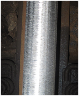三是在濟南地鐵R1線進行全線新軌預打磨。相關研究證明,新軌在開通前進行預打磨對鋼軌,去除表面脫碳層和部分安裝時造成的病害,能在后期運營中大大降低鋼軌出現疲勞傷損的幾率,尤其是微小裂紋、擦傷、焊接頭不平順等,能起到很好的消除作用。下圖11為打磨線路后的宏觀表面。