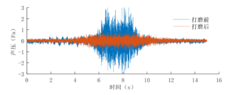 二是在廣州有軌電車海珠試驗段進行槽型軌修復性打磨。廣州有軌電車敷設在珠江邊上,沿途經過兩個高檔住宅小區,因接頭和波磨的原因導致輪軌接觸噪聲讓居民抱怨。經過打磨后,輪軌關系改善明顯,列車運行噪聲最大降低了5分貝。圖9是波磨打磨前后對比,圖10噪聲打磨前后測試結果。