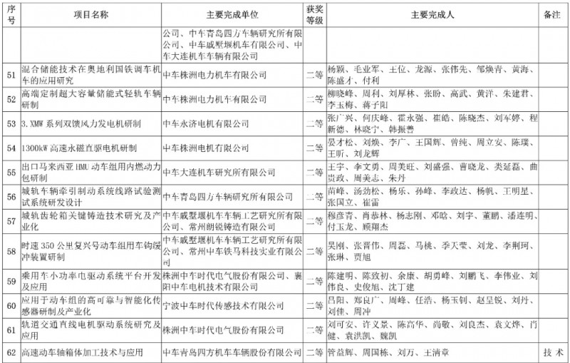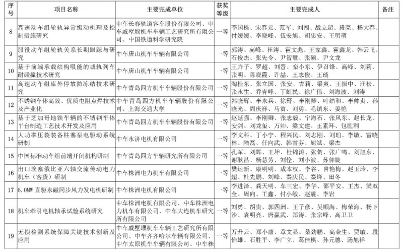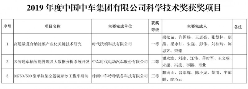 中國中車集團有限公司,授予3項科技成果“2019年度中國中車集團有限公司科學技術獎”,其中一等獎1項、二等獎1項、三等獎1項。