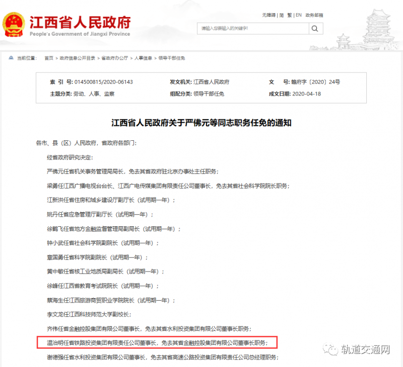 4月18日,江西省下發一批領導干部任免通知。其中提及,溫治明任江西省鐵路投資集團有限責任公司董事長,免去其省金融控股集團有限公司董事長職務。