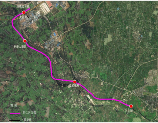 本項目位于大邑縣晉原鎮、蘇家鎮和安仁鎮境內,整體線路呈北向南敷設。線路北起成蒲快鐵大邑站,南至安仁古鎮劉氏莊園;線路主要沿斜江河走行,沿途串聯了成蒲快鐵大邑站、蘇家鎮、四川電影電視學院、建川博物館、劉氏莊園等重要節點,建成后將對大邑縣和安仁古鎮的旅游發展有積極的促進作用。線路全長11.2公里,均采用高架敷設,共設置4座車站(大邑站、光華大道站、蘇家鎮站、安仁站),其中1座換乘站(大邑站,與成浦快鐵及規劃地鐵1號線換乘),平均站間距為3.6公里,最大站間距3.8公里,最小站間距 3.3公里。設置1座車輛基地,1座控制中心(位于車輛基地內)。項目計劃于2017年10月開工,于2019年3月開通試運營,總工期1年6個月。工程總投資約19.9億元。