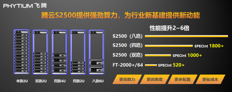 騰云S2500將為行業新基建提供更高算力、更高密度、更多配置、更低成本的解決方案。例如,一個機柜數量的FT-2000+服務器所提供的算力,僅用1/3數量的S2500四路2U服務器或1/2數量的S2500雙路2U服務器就可以實現,系統建設成本進一步壓縮。