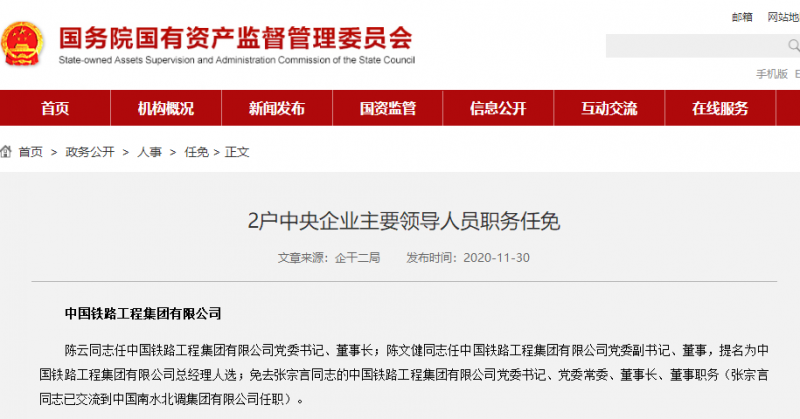 免去張宗言同志的鐵路工程集團有限公司黨委書記、黨委常委、董事長、董事職務,張宗言同志已交流到南水北調集團有限公司任職。