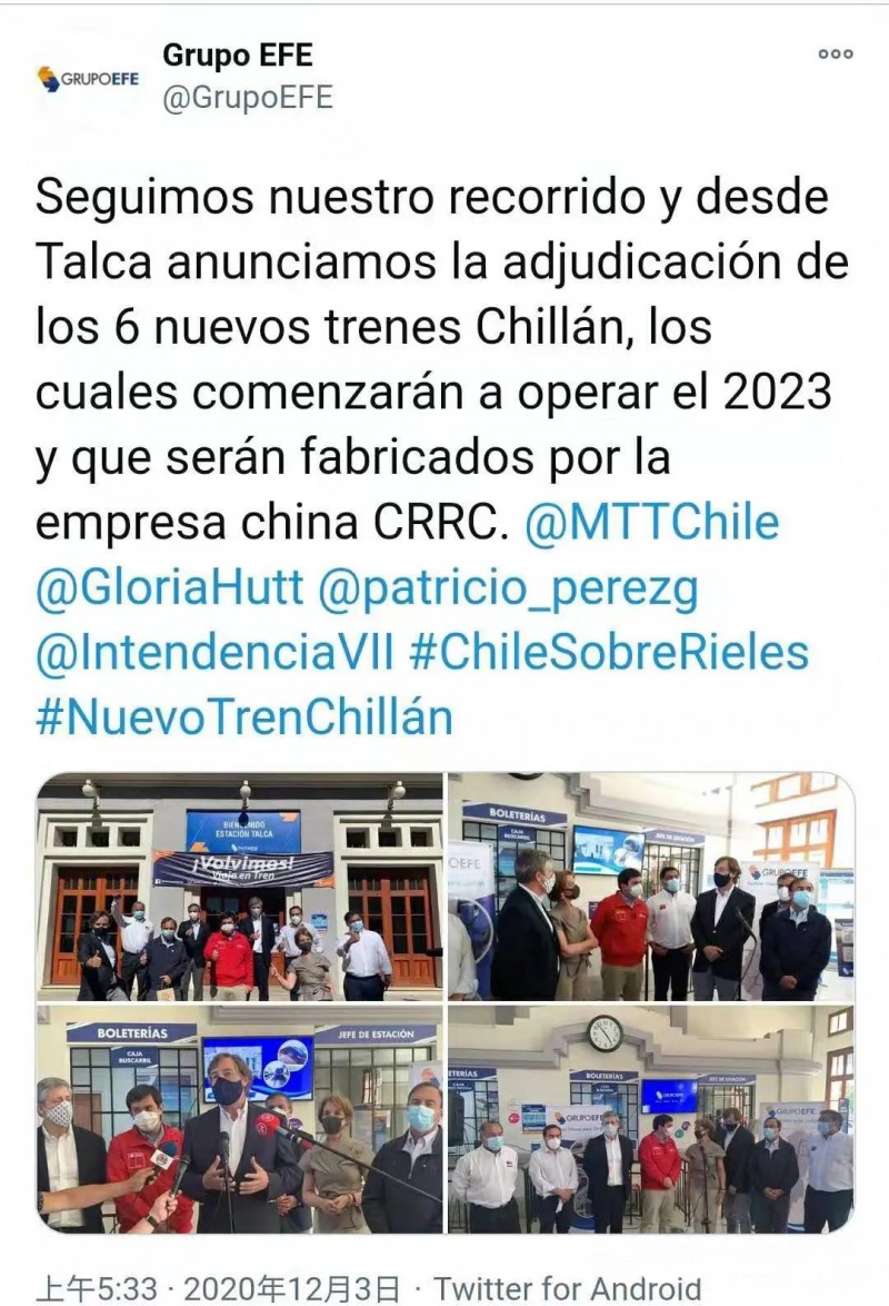 2018年10月,智利國家鐵路公司宣布中車四方股份公司聯合體中標比奧比奧和阿勞卡尼亞大區共13列(36輛)軌道車輛采購項目,包括10列3車編組電動車組(EMU)與3列2車編組內燃動車組(DMU)。