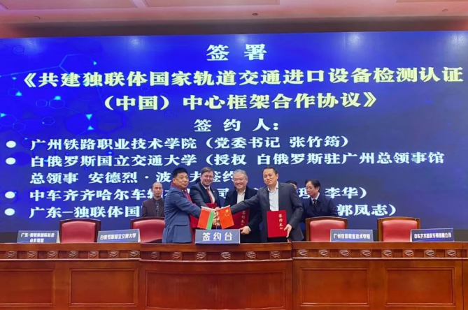 北京時間12月4日,在廣東省“一帶一路”職業(yè)教育聯(lián)盟年會上,廣州鐵路職業(yè)技術(shù)學(xué)院、白俄羅斯國立交通大學(xué)、中車齊齊哈爾車輛有限公司及廣東-獨(dú)聯(lián)體國際科技合作聯(lián)盟共同簽署了“共建獨(dú)聯(lián)體國家軌道交通進(jìn)口設(shè)備檢測認(rèn)證()中心框架合作協(xié)議”。