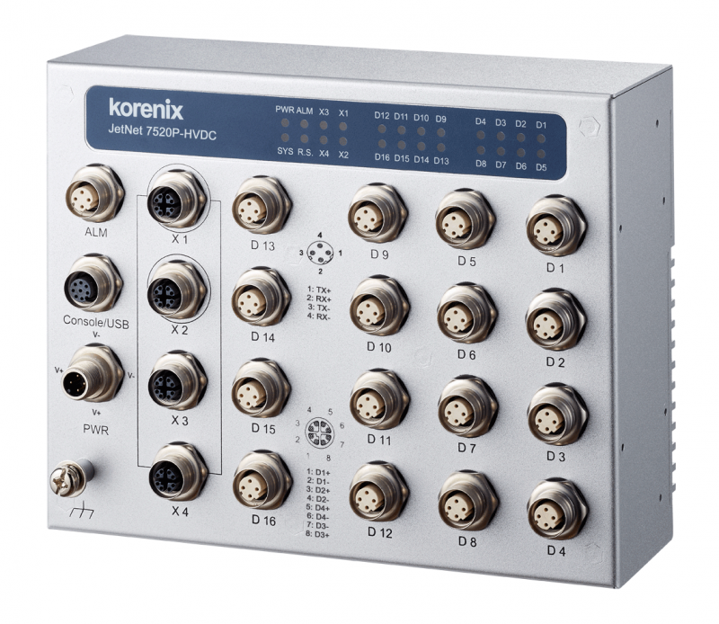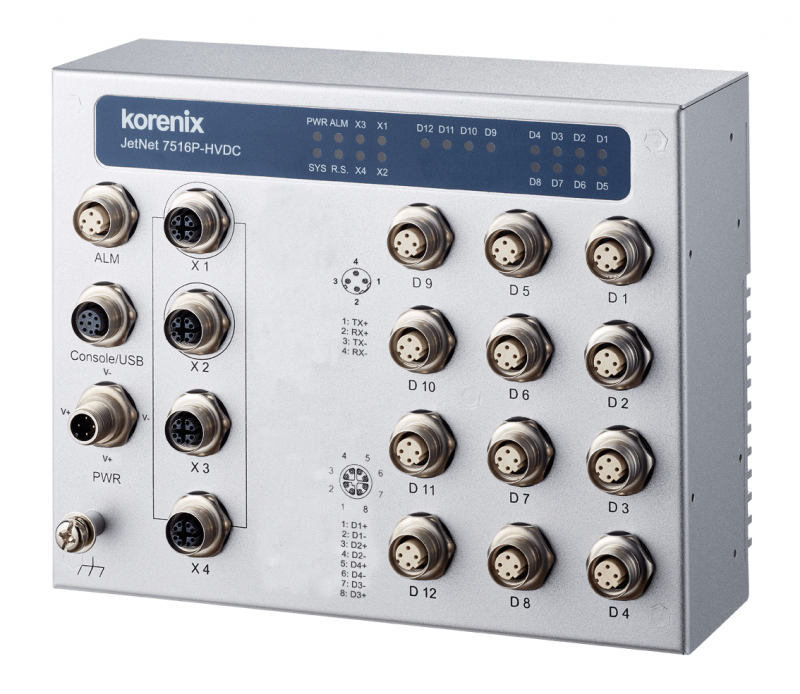 近日,北爾電子集團(tuán)旗下專注于提供工業(yè)有線和無(wú)線網(wǎng)絡(luò)通信解決方案的公司—科洛理思技術(shù)推出新產(chǎn)品:工業(yè)級(jí)M12 接頭的PoE交換機(jī)-JetNet 7520P-HVDC / 7516P- HVDC。這是一款工業(yè)級(jí)M12接頭得以太網(wǎng)交換機(jī),具有16/12 個(gè)M12 D-Code快速以太網(wǎng)端口,4個(gè)M12 X-Code千兆以太網(wǎng)端口。并且,快速以太網(wǎng)端口嵌入了PSE。該電源系統(tǒng)支持廣泛的輸入電源,可以滿足大多數(shù)現(xiàn)代列車的電源需求。此外,插拔式和M12連接頭有助于節(jié)省列車的維護(hù)時(shí)間。JetNet7520P / 7516P以太網(wǎng)交換機(jī)設(shè)計(jì)了硬件旁路功能,可為鐵路部署網(wǎng)絡(luò)應(yīng)用中提供更可靠和更高效的方案。