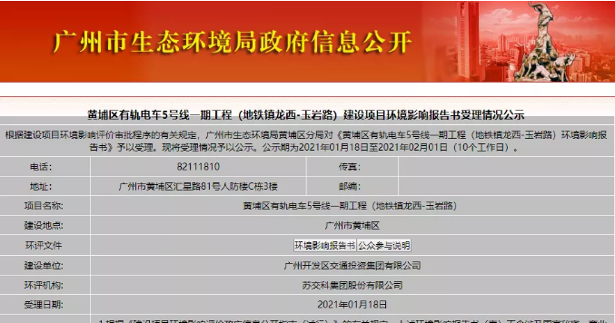 1月18日,廣州市生態環境局發布了黃埔區有軌電車5號線一期工程(地鐵鎮龍西-玉巖路)建設項目環境影響報告書受理情況公示。此次公示期為2021年1月18日至2021年2月1日,共10個工作日。