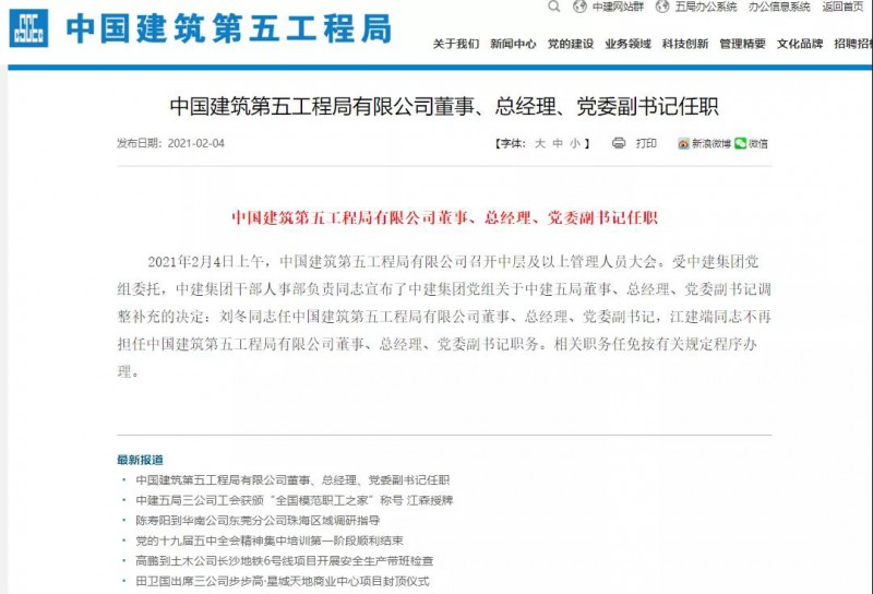2021年2月4日上午,建筑第五工程局有限公司召開中層及以上管理人員大會(huì)。受中建集團(tuán)黨組委托,中建集團(tuán)干部人事部負(fù)責(zé)同志宣布了中建集團(tuán)黨組關(guān)于中建五局董事、總經(jīng)理、黨委副書記調(diào)整補(bǔ)充的決定:劉冬同志任建筑第五工程局有限公司董事、總經(jīng)理、黨委副書記,江建端同志不再擔(dān)任建筑第五工程局有限公司董事、總經(jīng)理、黨委副書記職務(wù)。相關(guān)職務(wù)任免按有關(guān)規(guī)定程序辦理。