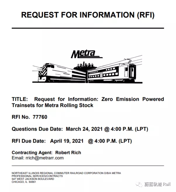 2021年2月,美國芝加哥通勤鐵路公司董事會批準了一項計劃,將零排放鐵路車輛。當地時間3月19日,鐵路公司正式發布招標信息(RFP),邀請列車制造商提供零排放鐵路車輛的方案。招標截止時間:2021年4月19日 16:00(當地時間)