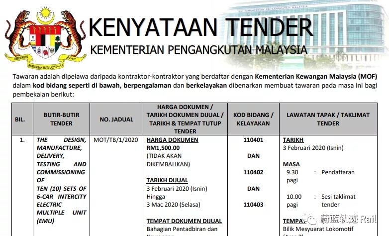 2020年1月,馬來亞鐵道公司發布招標信息,將采購10列全新列車。