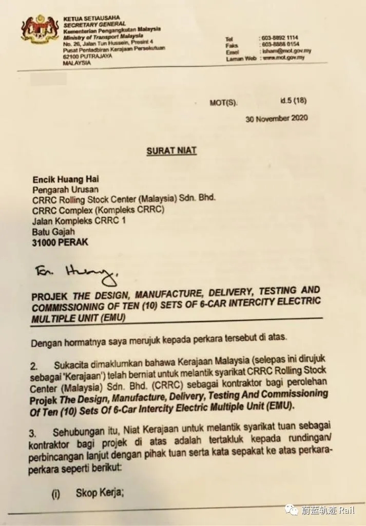 2020年12月,交通部門向中車株機發送談判意向書(LOI)。