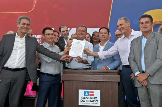 2019年12月10日,在巴伊亞州長魯伊·科斯塔(演講桌左)和駐巴西大使楊萬明(演講桌右)的見證之下,比亞迪被授予巴伊亞云軌一期工程的開工許可證
