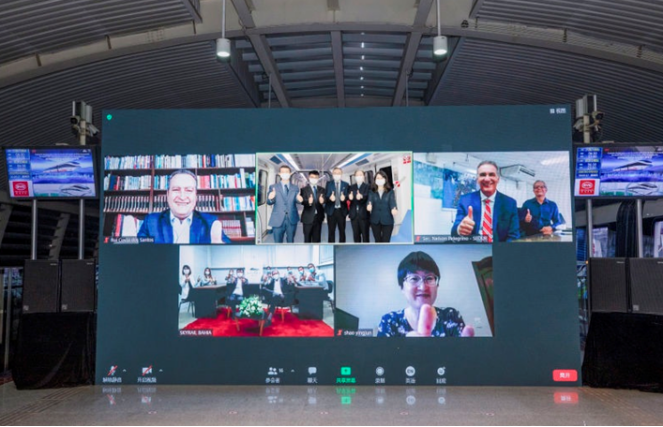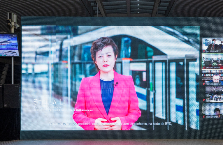 下線儀式在比亞迪全球總部深圳舉行,巴西巴伊亞州州長魯伊·科斯塔、副州長若昂·里昂,駐巴西大使館公使銜參贊邵英軍女士等線上共同見證。