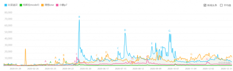 同時,對比比亞迪漢和其他品牌車企的車型熱度,通過2020年的百度指數(shù)發(fā)現(xiàn),比亞迪漢的百度搜索指數(shù),在同級別新能源車產(chǎn)品中遙遙領(lǐng)先。