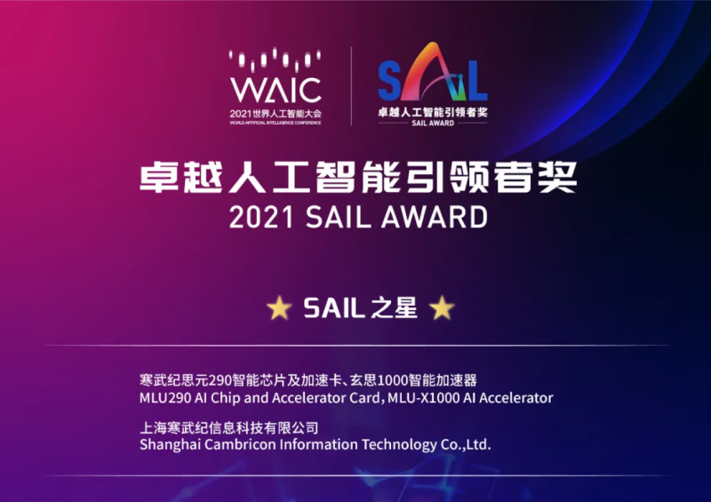值得一提的是,世界人工智能大會組委會還發布了2021年度SAIL獎榜單,寒武紀憑借“寒武紀思元290智能芯片及加速卡、玄思1000智能加速器”,從眾多參評項目中脫穎而出,斬獲SAIL之星大獎。