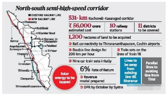 印度喀拉拉邦鐵路發展有限公司于6個多月前已將項目的招標方案提交給鐵道部進行審核,目前正在等待中央政府的批準。計劃在一年內完成總體布局圖,時間表,招標文件,紅樹林砍代批準許可以及土地收購等。