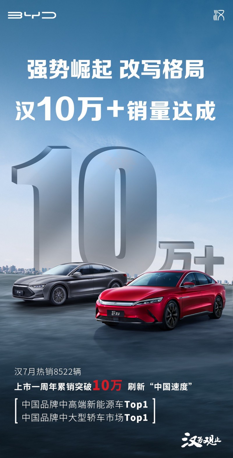 今年7月,比亞迪漢銷量同比增長607%,保持穩健增長態勢。上市一年多時間,比亞迪漢累計銷售已經突破了10萬輛,雄踞品牌中高端新能源車Top1及品牌中大型轎車市場Top1。
