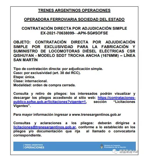 2021年9月9日,阿根廷國家鐵路運營公司啟動了一項采購流程,為阿根廷圣馬丁線采購3臺SDD7內燃機車。此次機車采購現匯采取直接簽訂的方式,無法招標也不需要提供融資。