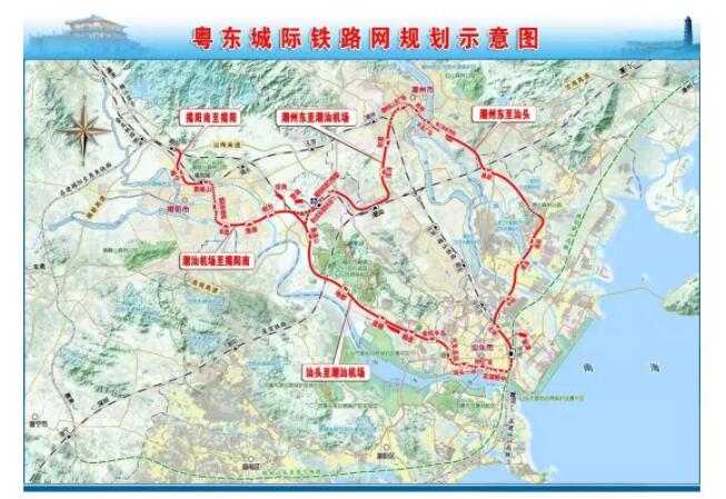 粵東城際鐵路“一環一射線”項目由汕頭至潮汕機場段、潮州東至潮汕機場段、潮汕機場至揭陽南段、潮州東至汕頭段、揭陽南至揭陽段五個項目組成,項目線路總長140公里,鐵路等級為城際鐵路,設計行車速度為160公里/小時。