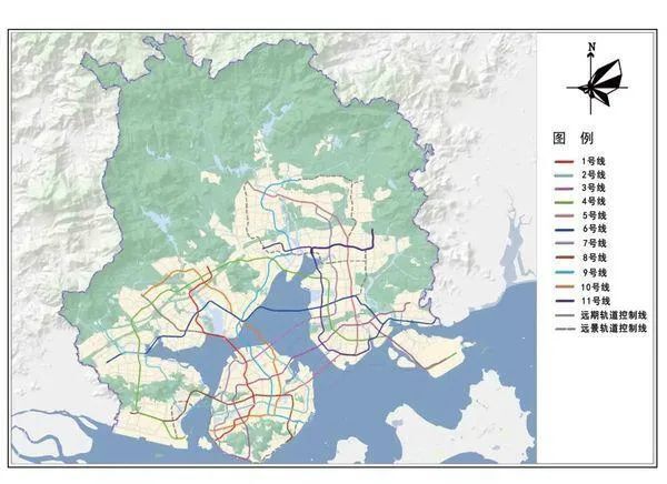 廈門市遠期2035年城市軌道交通規劃線網由12條線路組成,總規模約493公里。其中7條普線,含1號線、2號線、3號線、6號線、7號線、10號線、11號線,約297公里;4條快線,含4號線、5號線、8號線、9號線,約186公里;1條軌道控制線,約10公里。遠景規劃線網在遠期線網基礎上增加5條軌道控制線,增加規模約79公里,線網總規模約572公里。