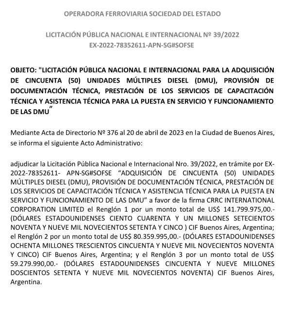 當地時間5月16日,阿根廷鐵路公司宣布授予中國中車唐山公司供應 50 列3車編組全新列車的訂單,總價值1.8億美元。