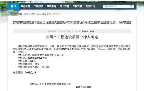 近日,蘇州公共資源交易中心發布蘇州市軌道交通5號線工程綜合監控集成、采購項目中標公告,確認深圳市賽為智能股份有限公司為該項目的中標人,中標金額為20999.999998萬元。