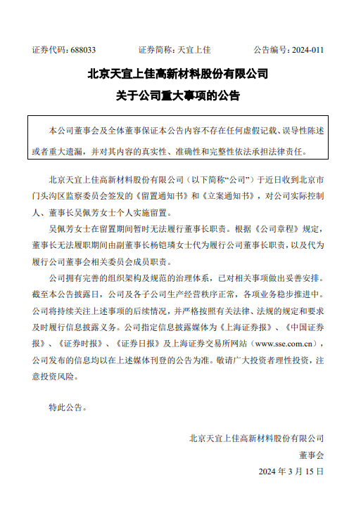 天宜上佳3月14日晚公告,公司于近日收到北京市門頭溝區(qū)監(jiān)察委員會(huì)簽發(fā)的《留置通知書》和《立案通知書》,對公司實(shí)際控制人、董事長吳佩芳個(gè)人實(shí)施留置。