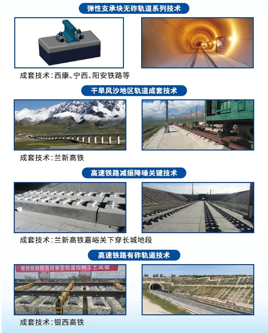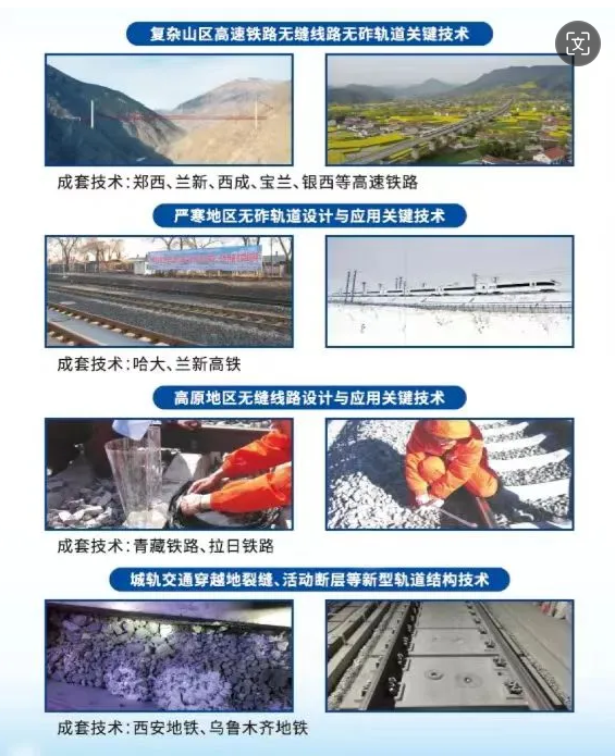 針對全國各類復雜氣候和地質條件,經數十年的技術積累,工程研究中心掌握了以復雜山區高速鐵路無縫線路無砟軌道關鍵技術、嚴寒地區無砟軌道設計與應用關鍵技術等為代表的一系列核心技術成果,在高速鐵路、普速鐵路和城市軌道交通工程中得到廣泛應用。