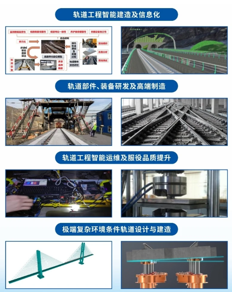 面向交通強國、制造強國等國家重大戰略需求,工程研究中心致力于以高速鐵路、重載鐵路、城際鐵路和城市軌道交通等為研究對象,以項目為依托,聚焦軌道工程智能建造及信息化,軌道部件、裝備研發及高端制造,極端復雜工程與環境條件下軌道設計與建造,軌道工程智能運維及服役品質提升等軌道交通領域重點任務開展基礎研究與技術創新。