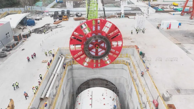 “新征程號”盾構機整機總長101米,最大開挖直徑13.5米,重2634噸,裝機總功率6500千瓦。此次吊裝下井的刀盤重320噸,由1個中心塊與6個分塊拼裝焊接組成,當天,“新征程號”盾構機刀盤在500噸履帶吊和350噸履帶吊的協同操作與地面作業人員和井下作業人員的密切配合下,通過起吊、翻身、旋轉等一系列操作,成功吊裝下井,并精準對接在主驅動上。下一步,項目團隊將即刻啟動管線連接、各系統空載試驗和整機聯調聯試等工作,為后續盾構始發夯實基礎。