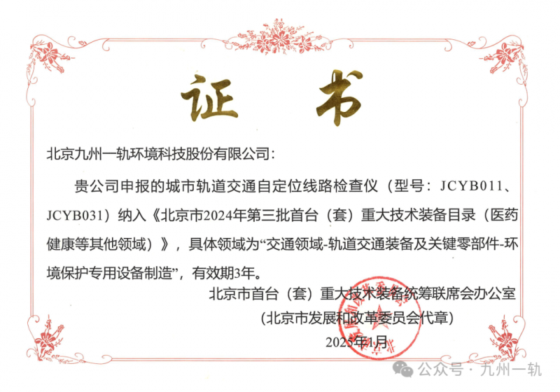 首臺(套)重大技術裝備是指國內實現重大技術突破、擁有知識產權、尚未取得明顯市場業績的裝備產品。獲得此認證,標志著九州一軌車載軌道聲紋監測技術取得了產品開發的成功、實現了行業技術領先。