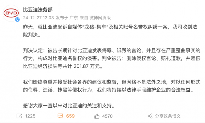 據悉,在近兩年的時間里,比亞迪累計起訴20余個“黑號”,同時對30多個重點“黑號”進行密切關注,對其發布的內容及評論區持續做證據保全。值得關注的是,2024年年底,比亞迪起訴自媒體博主“龍豬-集車”的名譽糾紛權案勝訴,其長期侮辱、詆毀比亞迪,構成名譽侵權,法院判決“龍豬-集車”刪除侵權言論、公開賠禮道歉,并賠償201.87萬元。