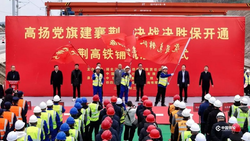 湖北鐵路集團黨委委員、副總經理杜有福,湖北漢十鐵路公司黨委書記、董事長胡劍鴻,集團公司黨委委員、副總經理徐濤,中鐵一局集團副總經理潘小虎,各施工、監理等參建單位人員及襄陽市、荊門市地方政府代表出席了鋪軌啟動儀式。儀式現場向參建單位授予了“黨員先鋒隊”“青年突擊隊”“工人先鋒號”旗幟。