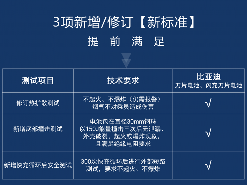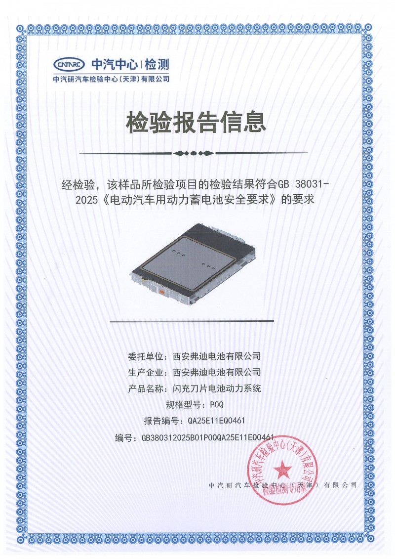近日,比亞迪刀片電池和閃充刀片電池雙雙提前通過最新國標GB 38031-2025《電動汽車用動力蓄電池安全要求》全項檢測,并獲得中汽研汽車檢測中心專業認證證書,提前滿足新國標要求。