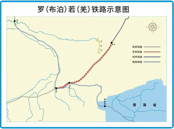 羅若鐵路全長297.73公里,設計時速120公里,線路東起哈羅鐵路羅中站,穿越羅布泊干涸湖盆區,在米蘭鎮接入格庫鐵路米蘭站,沿格庫鐵路引入若羌站,鐵路建成后將重點服務羅布泊鉀鹽資源開發。