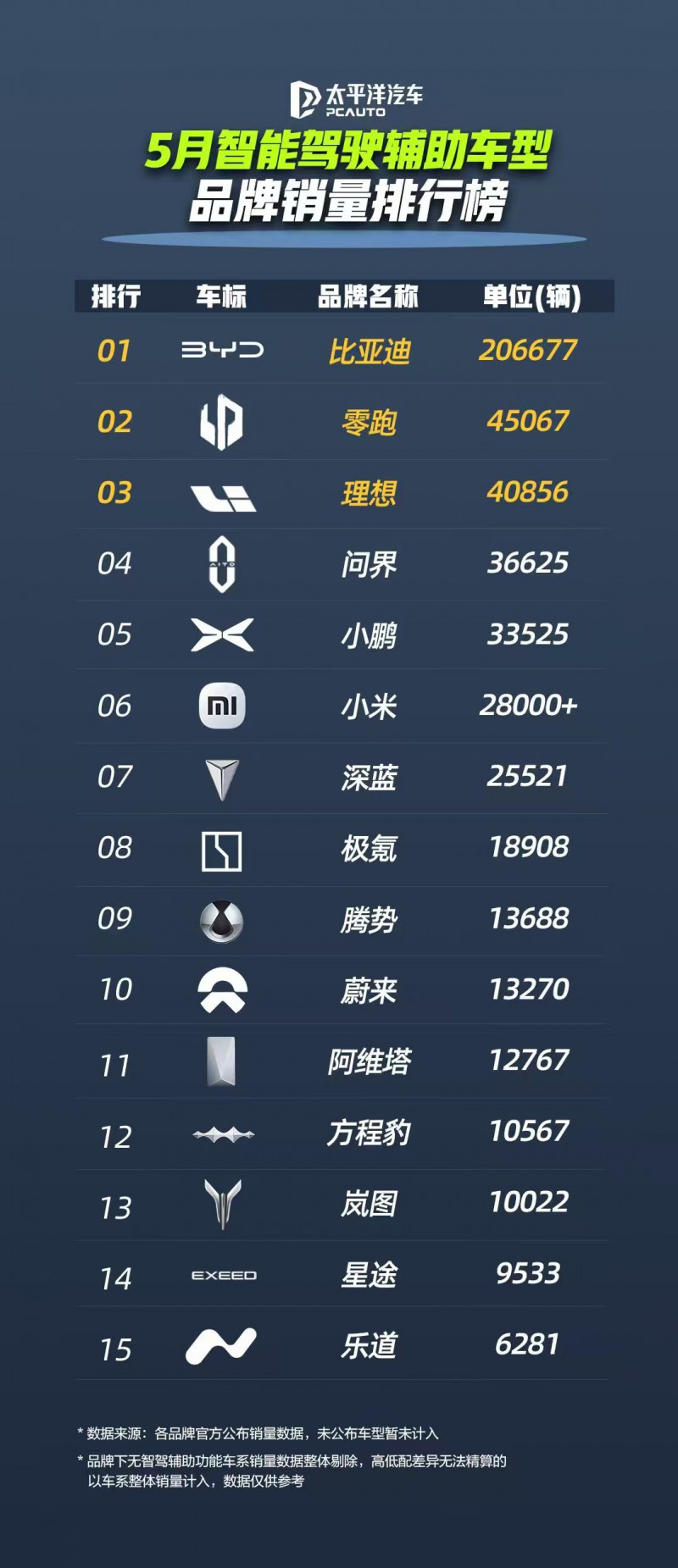 從車型品牌維度深入剖析,王朝系列和海洋網系列作為比亞迪的銷售主力軍,在 5 月表現依舊亮眼,智駕車型銷量達 206,677 輛,展現出強大的市場號召力。方程豹品牌盡管定位獨特,但其 5 月 10,567 輛的銷量成績,顯示出硬派越野與智能駕駛融合后產生的獨特魅力,市場潛力不容小覷。騰勢品牌憑借其高端家用定位,售出 13,688 輛智駕車,彰顯了其在中高端市場的穩固地位。仰望品牌雖銷量相對較少,僅為 127 輛,但其作為比亞迪沖擊高端智能駕駛市場的先鋒,以頂尖技術樹立了品牌高度,為后續發展奠定了良好基礎。