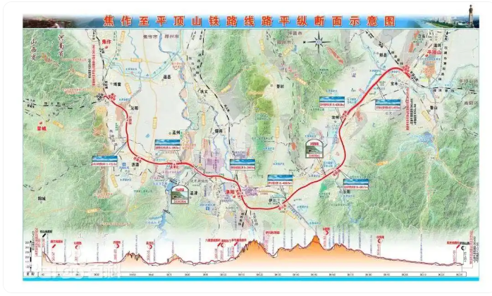 新建焦作至平頂山鐵路,線路起自鄭太高鐵玨山線路所,向南經(jīng)焦作市轄沁陽市,濟源市,跨黃河后引入鄭西高鐵洛陽龍門站,經(jīng)洛陽市伊川、汝陽縣,平頂山市轄汝州市,接入鄭渝高鐵平頂山西站。其中:全長6.34公里的邙山隧道和洛陽黃河公鐵兩用大橋被列為重點控制性工程。