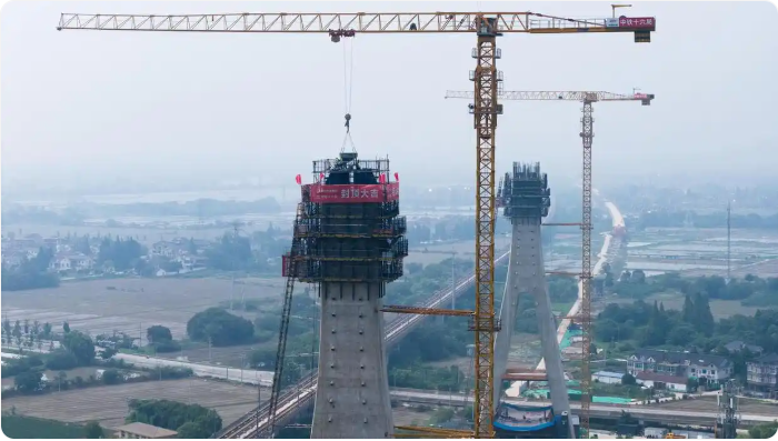 6月25日下午,經過5小時混凝土灌注,湖州交通集團下屬如通蘇湖城際鐵路(南潯至長興段)項目長興特大橋主橋斜拉橋首座主塔完成封頂,這標志著國內在建主跨最大城際鐵路混凝土梁斜拉橋進入梁、索施工新階段。