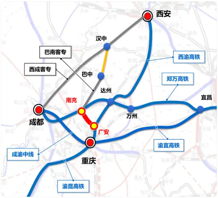 線路西接成達萬高鐵、漢巴南鐵路、蘭渝鐵路,東接西渝高鐵,接入國家路網。起于南充北站,途經南充順慶區、高坪區,廣安岳池縣、廣安區、華鎣市,止于在建西渝高鐵廣安東站。