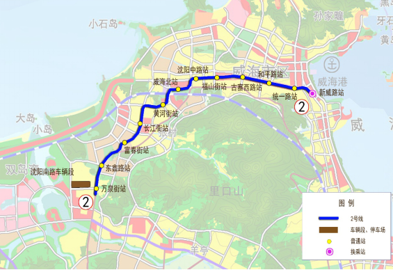 2號線西起威高工業園,東至威高廣場,長28.0公里,主要沿新初張路、和興路、沈陽南路、火炬路、世昌大道、新威路敷設。串聯威高工業園、雙島灣科技園、威海北站、威高廣場,建立了初村、雙島灣地區到老城中心,同時與威海北站、威海客運北站銜接,實現了對外樞紐站與城市軌道交通一體化。