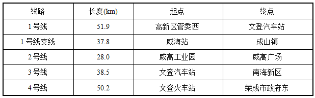 4號線西起文登火車站,東至榮成市政府東,全長50.2公里,主要沿S804省道、G309國道、成山大道敷設,建立文登、機場與榮成的快速聯系。
