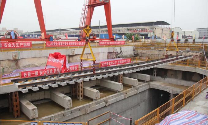 3月14日,在地鐵八號線北延段滘心鋪軌基地內,隨著兩臺10噸的龍門吊吊起第一節軌排,緩緩移到軌排井上空,慢慢落到軌道線路上,八號線北延段同福西至滘心段宣告正式進入鋪軌階段。為了最大限度降低施工對周邊的影響,八號線北延段主要沿道路敷設,并在軌道行經的學校、醫院、社區等敏感區域采用減振降噪技術,努力為周邊市民創造一個良好的環境。