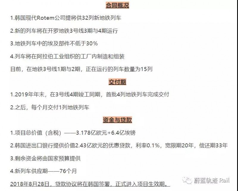 4月23日,埃及阿拉伯工業委員會(AOI)在總部與韓國現代Rotem公司簽訂列車合同,將為開羅地鐵3號線制造10列地鐵列車。