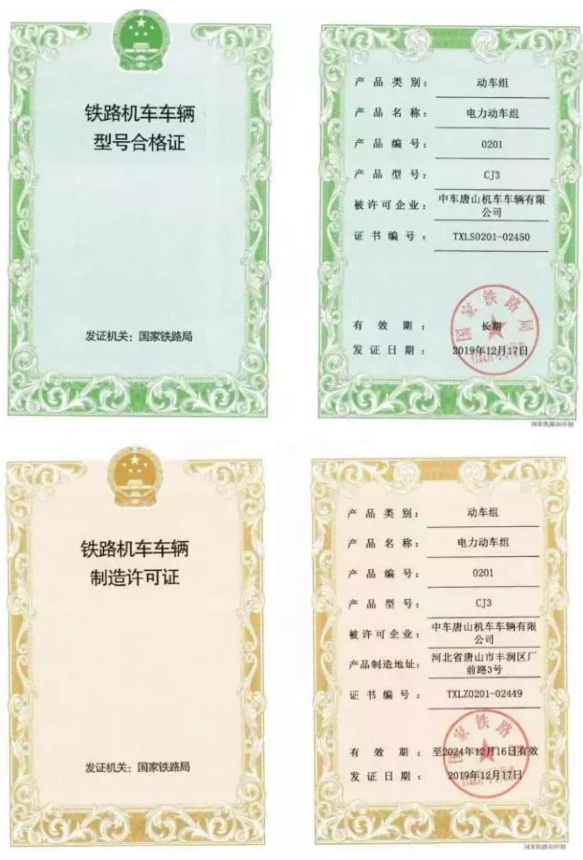 12月18日,中車唐山公司研制的CJ3型城際動車組獲得由國家鐵路局頒發的型號合格證和制造許可證,產品編號0201,標志著該型號動車組具備批量生產和上線運營的條件,將為我國城際交通網絡和打造1小時“都市圈”再添新利器。